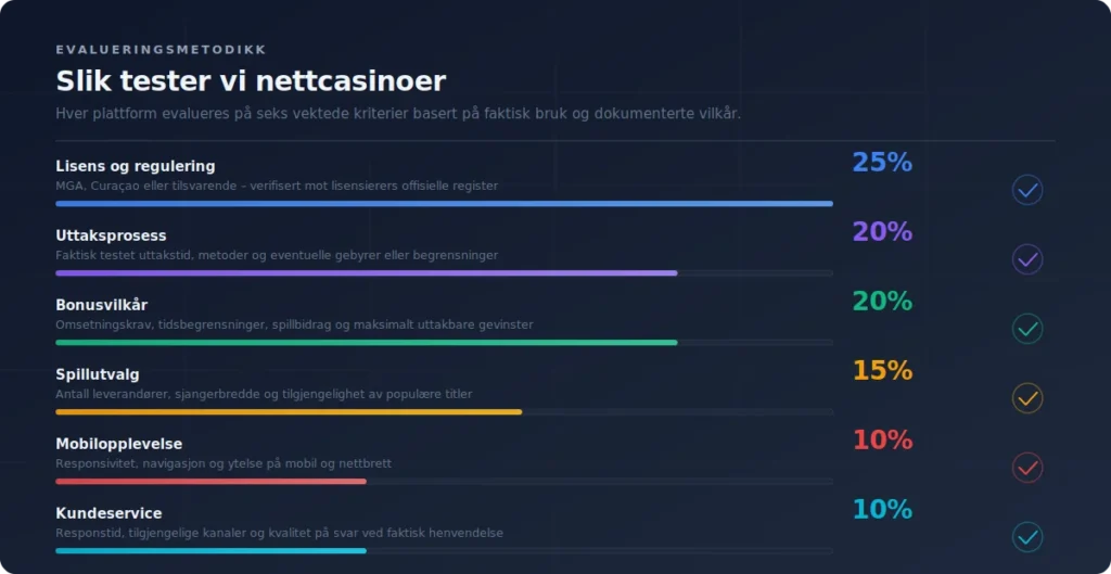 Vi vurderer ikke bare “størrelse”. Vi ser på omsetningskrav, maks innsats, maks uttak og tidsfrister. Seriøse casino gjør vilkårene enkle å finne, og de har regler som gir mening.